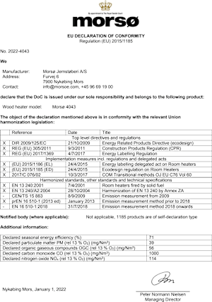 Morsø 4043 er med sin enkle stramme formgivning helt unik og let at indpasse i mange hjem. Ovnen er meget karakteristisk med sin højde, sine rene flader og det store indkig. Morsø 4043 har et regulært brændkammer, der gør den betjeningsvenlig ved påfyldning af en ny portion træ. Ovnen opfylder de strengeste miljøkrav, ligesom håndtaget altid er koldt.