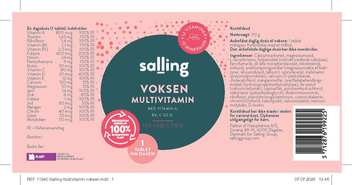 | Ingredienser | Calciumcarbonat, magnesiumoxid, L-ascorbinsyre, fyldemiddel (mikrokrystallinsk cellulose), ferrofumarat, dl-alfa-tocopherylacetat, nikotinamid, zinkoxid, antiklumpningsmidler (magnesiumsalte af fedt-syrer, siliciumdioxid, talkum), retinylacetat, stabilisator (polyvinylpyrrolidon), calcium-D-pantothenat, cholecalciferol, manganosulfat, overfladebehandlings-middel (hydroxypropylmethylcellulose), farvestof (calciumcarbonat), cuprisulfat, pyridoxinhydrochlorid, stabilisator (polyethylenglycol), thiaminmononitrat, riboflavin, pteroylmonoglutaminsyre, cyanocobalamin, chrom(III)chlorid, kaliumjodid, natriumselenit, natriummolybdat, D-biotin. |