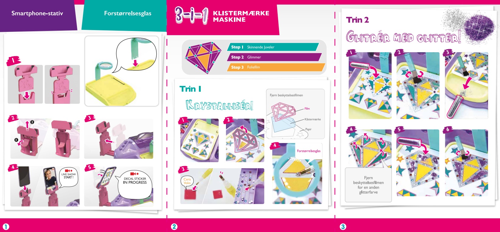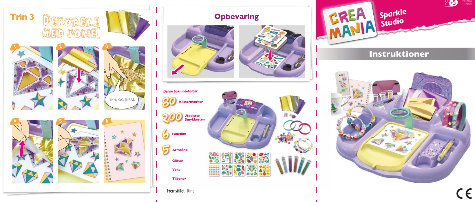 TRIN 2: Drys glimmeret med børsten, vælg glimmeret eller de farvede film, og dekorér klistermærket. TRIN 3: Påfør den metalliske film. Nu kan du skrælle klistermærket af og anvende det hvor du vil! Indeholder: 80 klistermærker til dekoration, 200 ædelsten, 6 metalliske film, 5 armbånd, voks, glimmer og andre tilbehør. Produktet har også en praktisk drejestand til din smartphone, så du kan dele dine kreationer med venner i realtid!