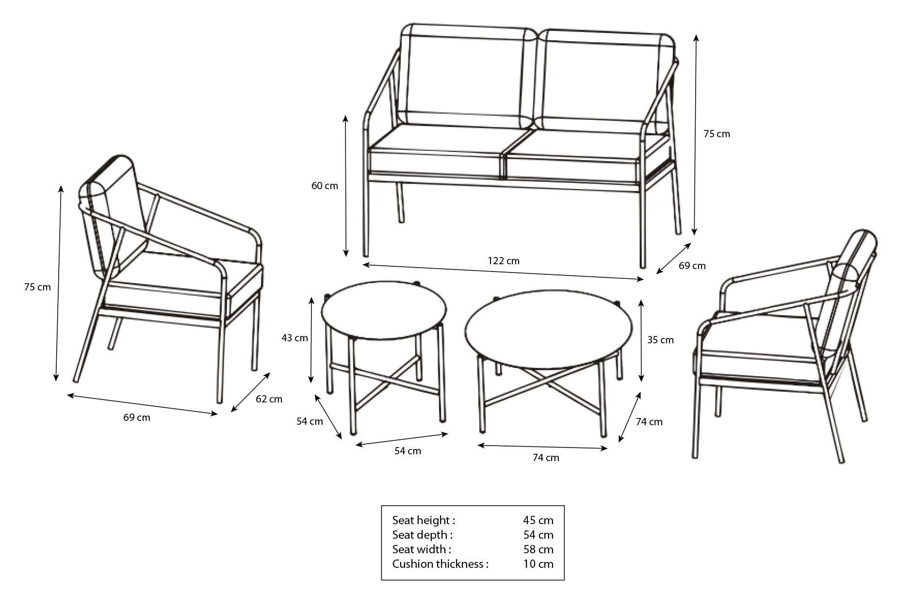 Enkelt og klassisk loungesæt bestående af 2 borde, 1 sofa og 2 stole. Loungesættet har rene linjer, og er holdt i en klassisk og enkelt stil. Troia passer ind på enhver terrasse, og er perfekt til hyggelige stunder.