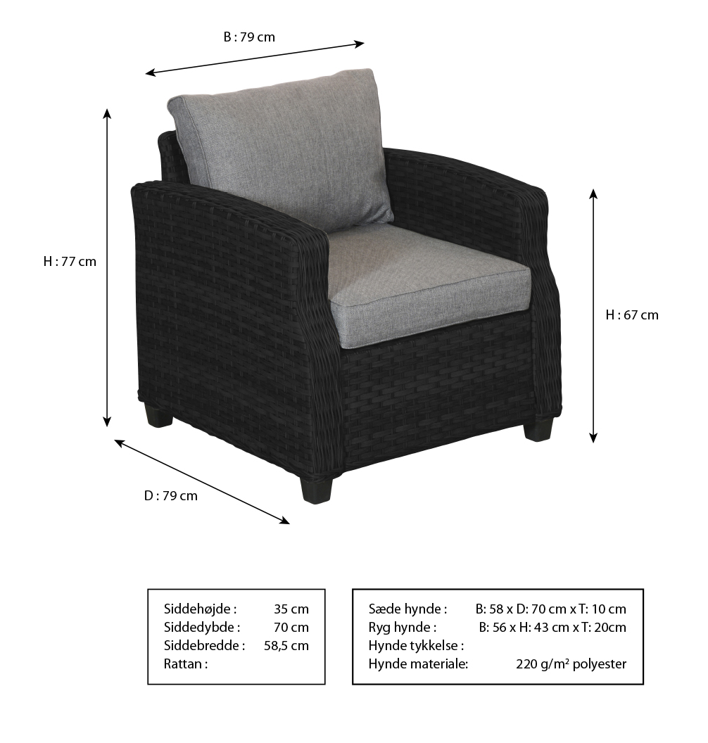 Loungestol i elegant look og vedligeholdelsesfrit materiale. Hvis du er til det klassiske og stilrene udseende, så er en Vila havestol lige noget for dig. Med et moderne sort rattan look, kan stolen pynte på enhver terrasse eller havestue. Med det komfortable armlæn og hynder på både sædde og ryglæn, kan man nemt sidde og nyde hyggen i flere timer.