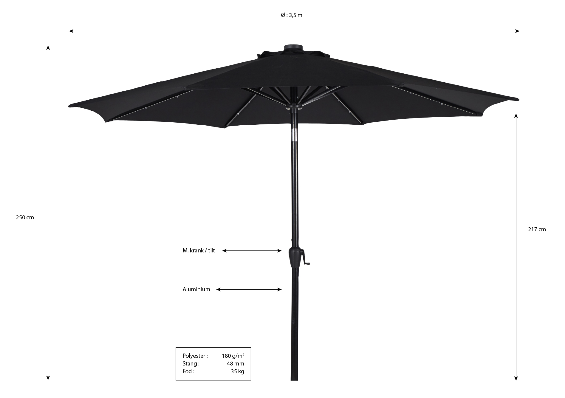 Parasol med LED lys. West palm parasollen har en diameter på 3 meter. Den her LED lys i ripperne, der giver et hyggeligt lys, som kan lyse 6 timer på en fuld opladning og oplades ved hjælp af solarpanel på toppen. Der er også mulighed for at vippe parasollen efter behov i forhold til solen da toppen er tiltbar. Parasollen slås op og ned ved hjælp af et håndtag. Stokken er produceret i sort aluminium med en diameter på 48 mm og dugen er i sort polyester og vejer 180g/m2.
